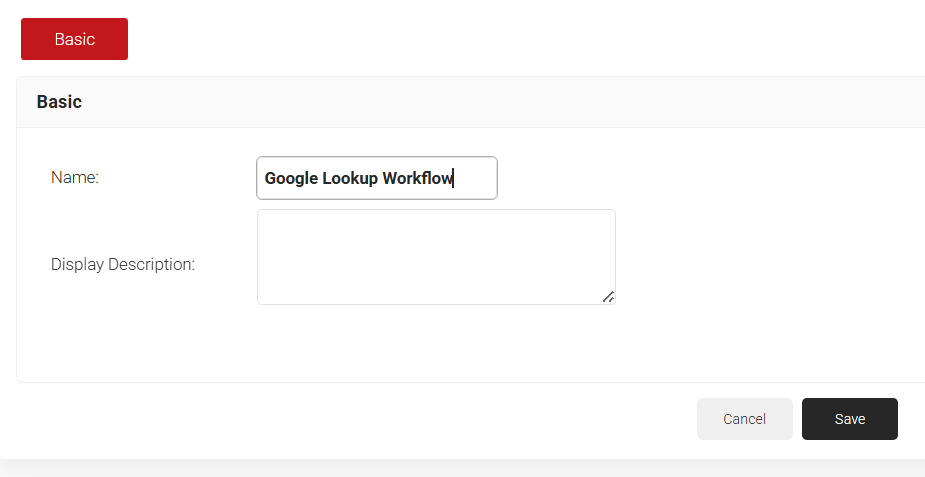 - On the displayed screen, enter a Name and Display Description for the policy workflow.