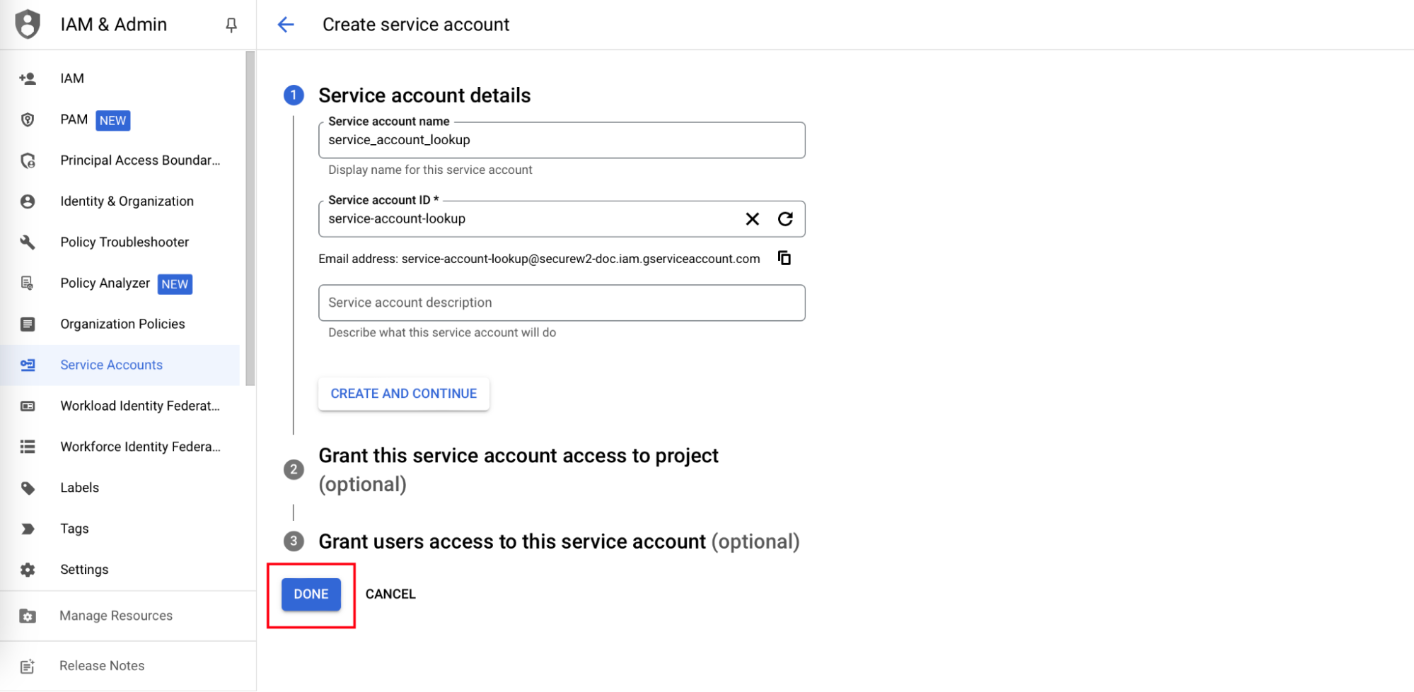 - Click DONE. The required service account will be created. Click on the service account link.
