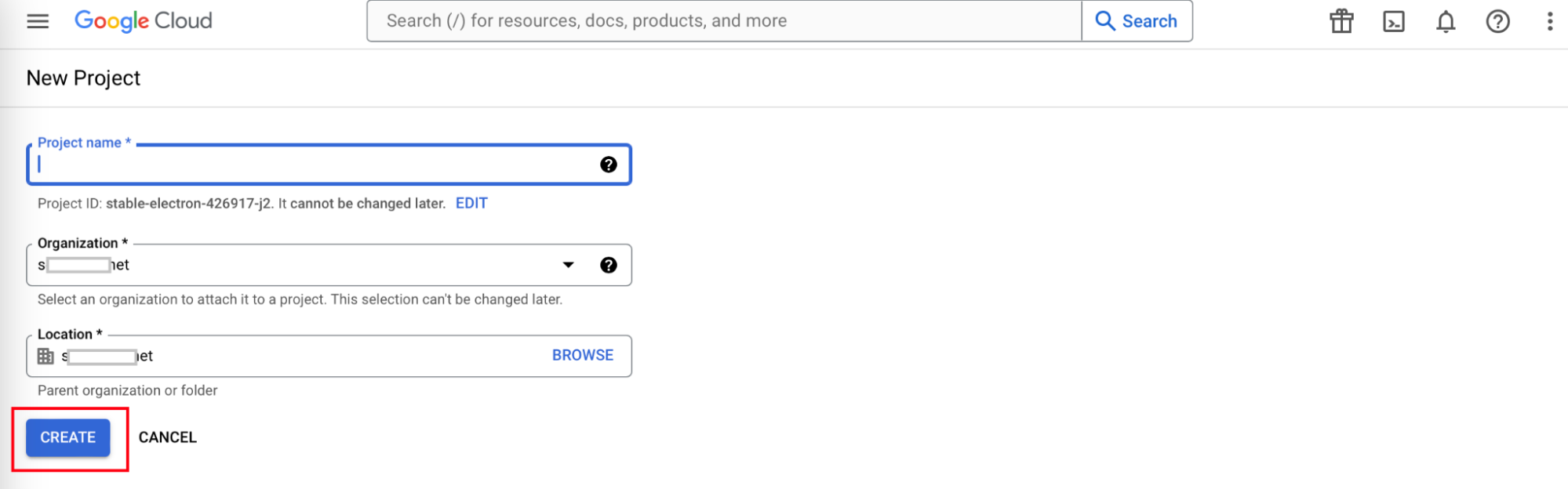 - In the New Project page, enter a name for the project in the Project name field.