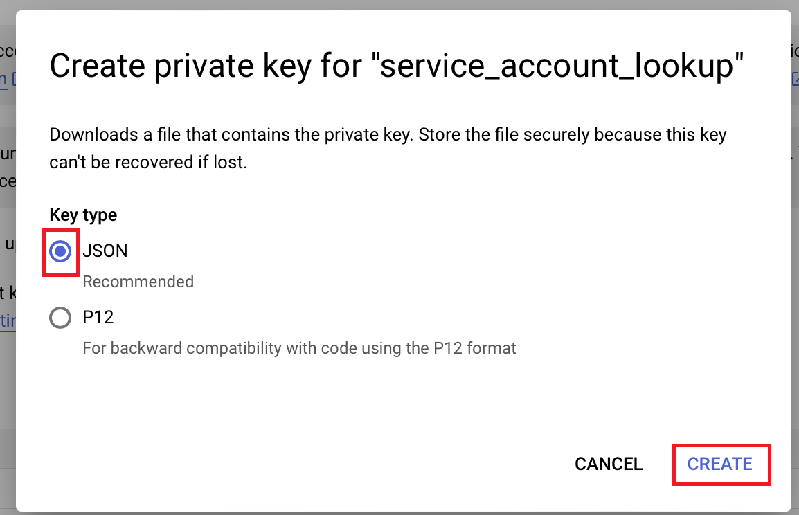 - In the Create private key pop-up, select Key type as JSON.