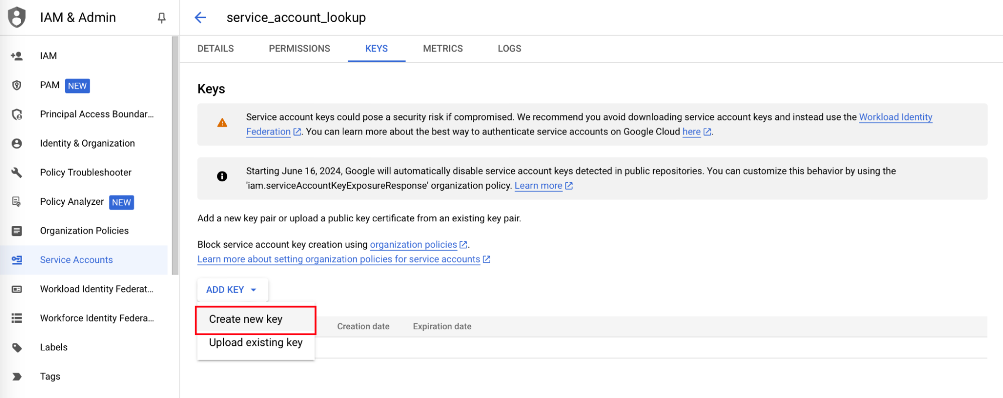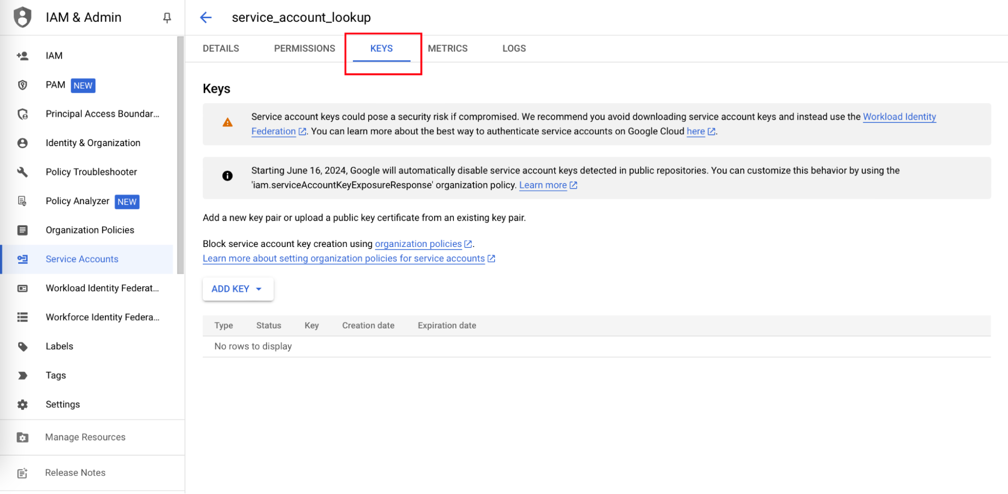 - In the service account page, click on the KEYS tab.