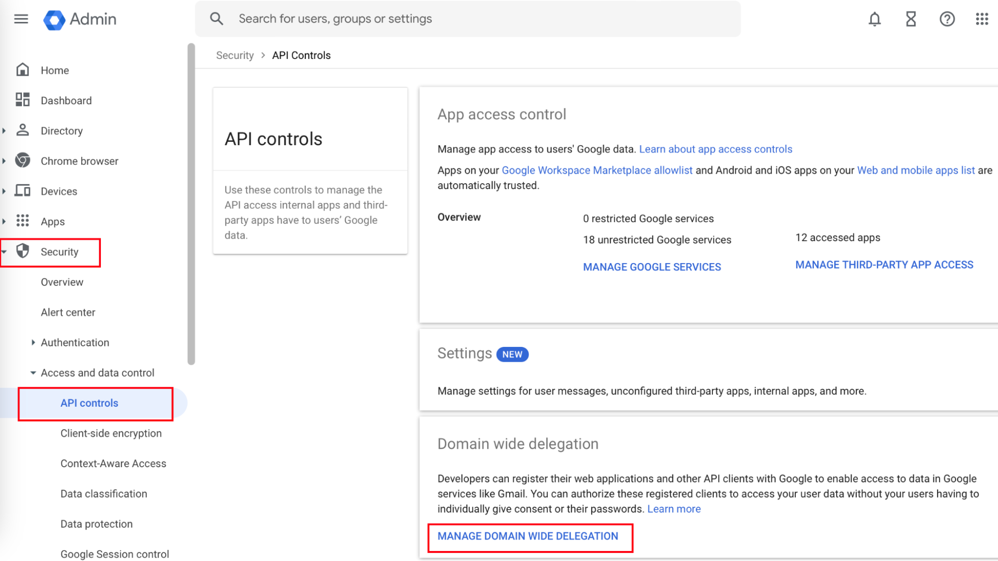 - In the Domain wide delegation section, click MANAGE DOMAIN WIDE DELEGATION.