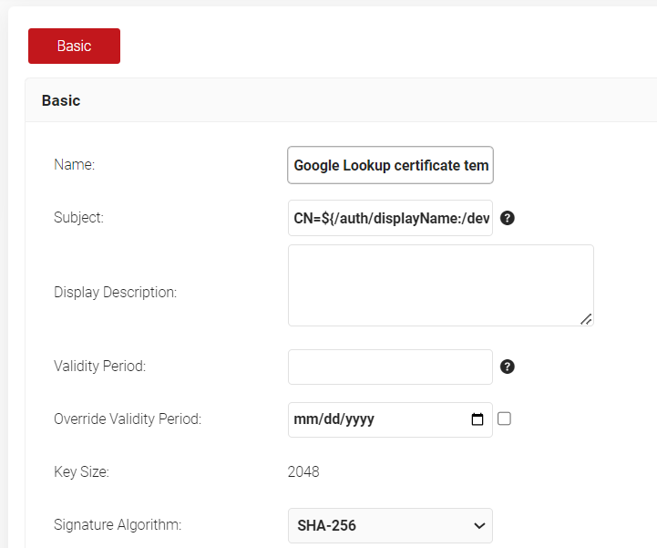 - In the Basic section, for the Name field, enter the name of the certificate template.