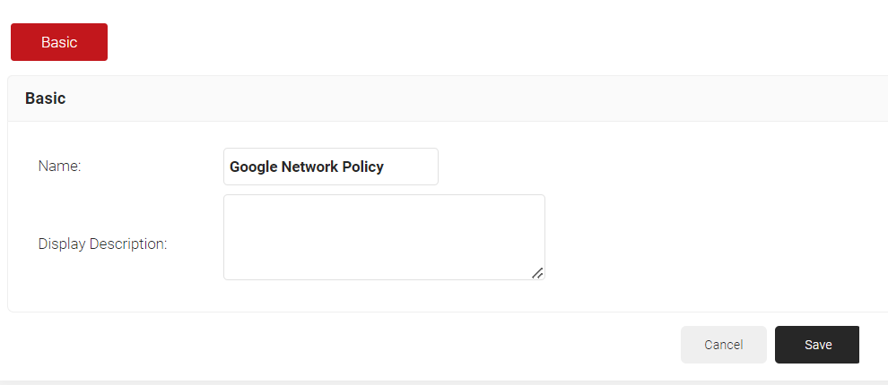 - On the displayed screen, enter a Name and Displayed Description for the network policy in the corresponding fields.