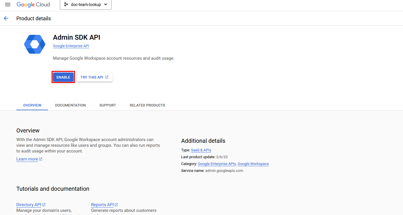 The Google Admin SDK API must be enabled to view and manage users, groups and devices present in the organization’s project.
