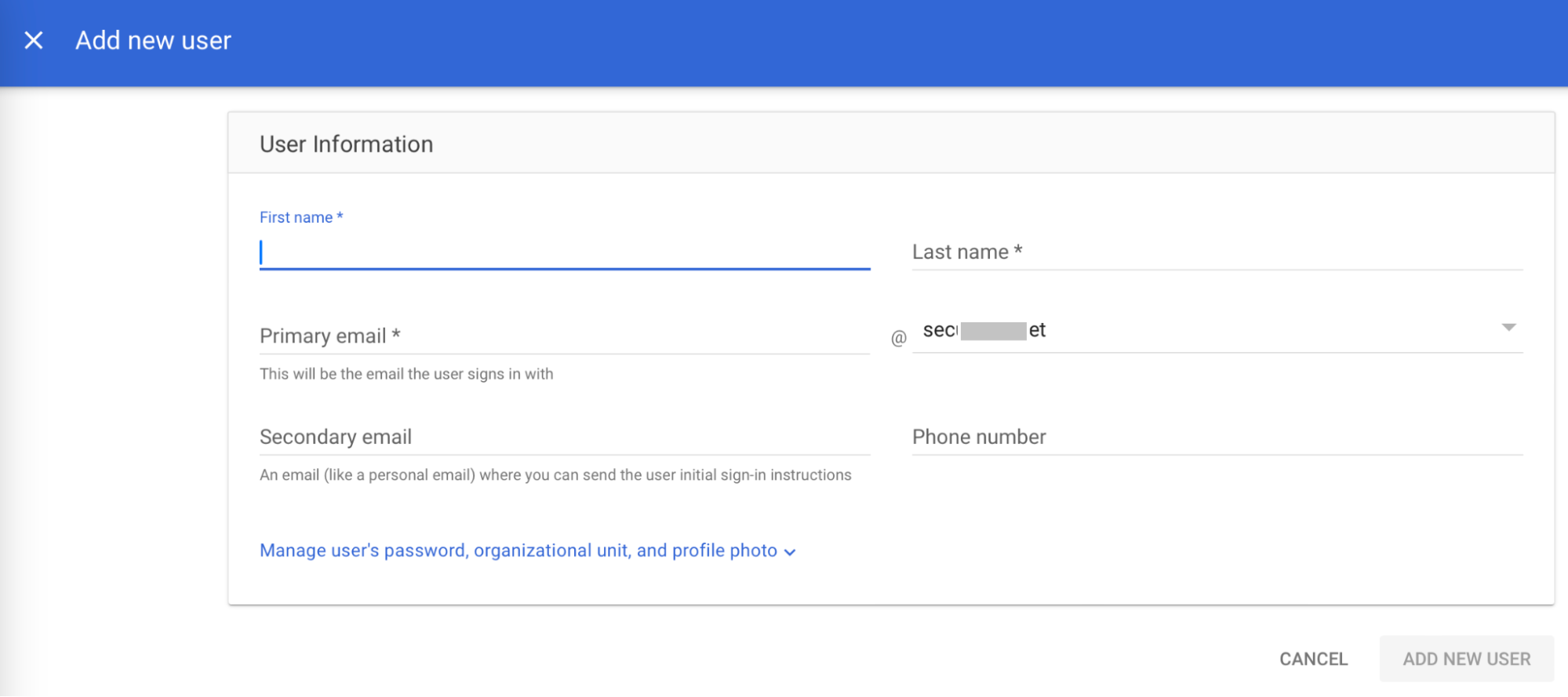- In the Primary email field, enter the organizational email of the user.