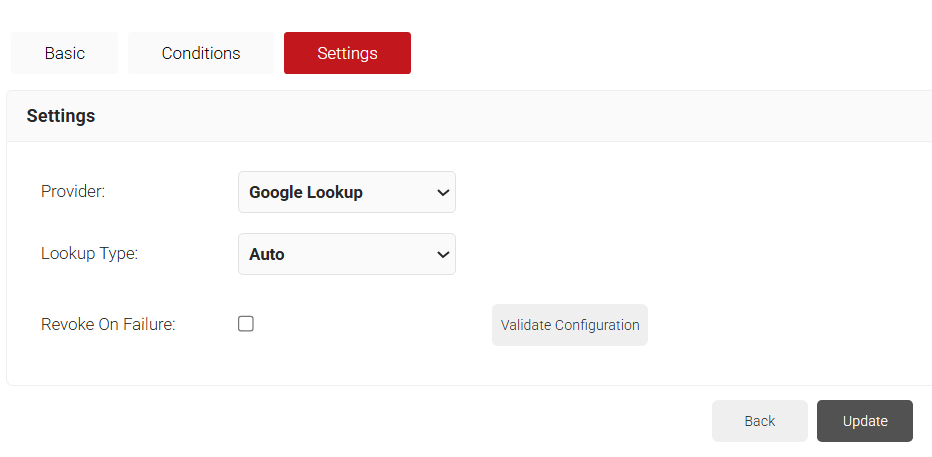 - Under the Settings tab, from the Provider drop-down list, select the Google Workspace Identity Lookup you created in the 5.2 Creating a Google Workspace Identity Lookup Provider section.