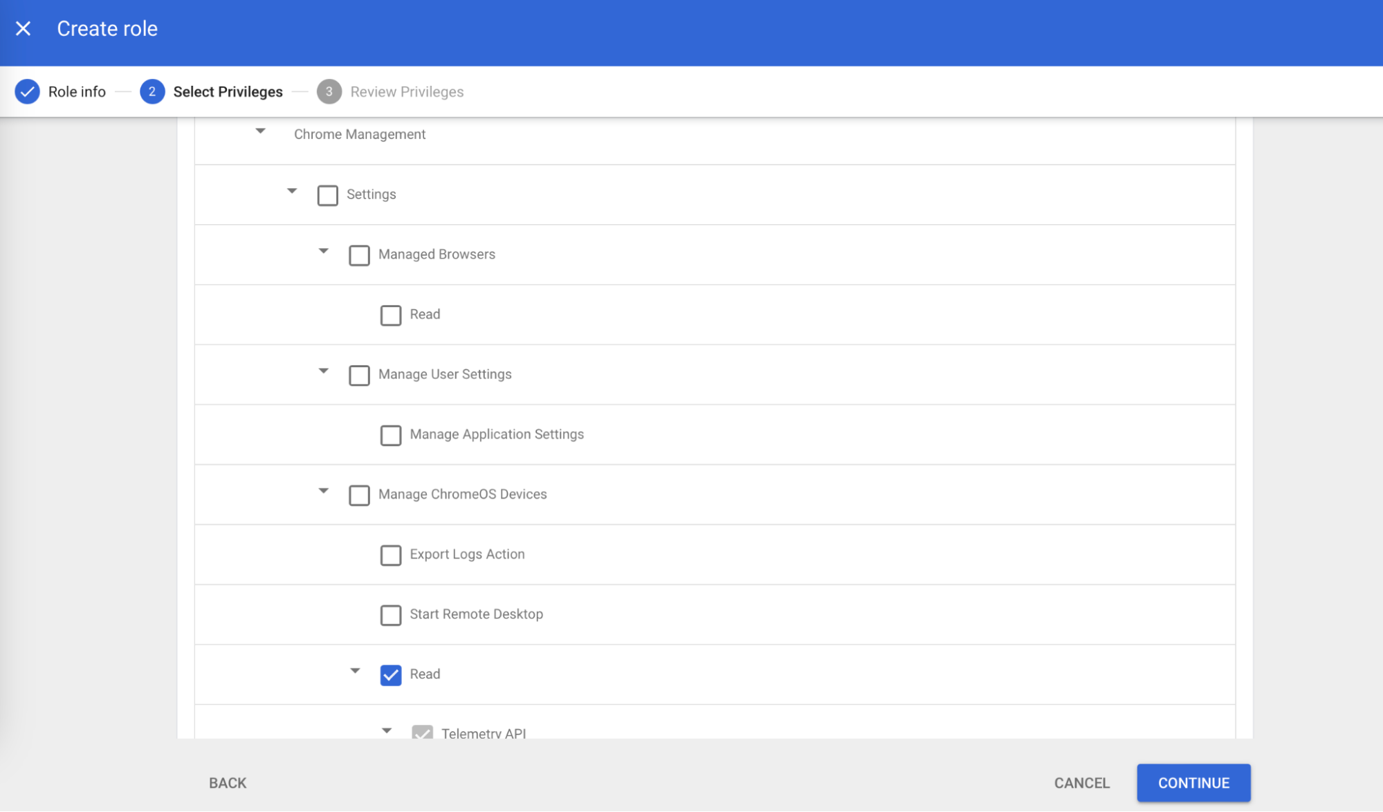 - Click CONTINUE. Review the privileges assigned and click DONE.