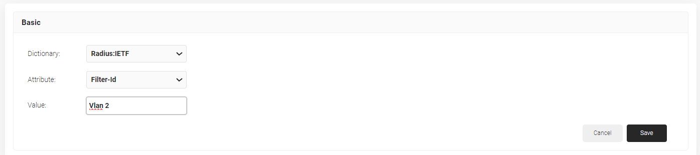 - From the Dictionary drop-down-list, select an option: Radius:IETF or Custom.