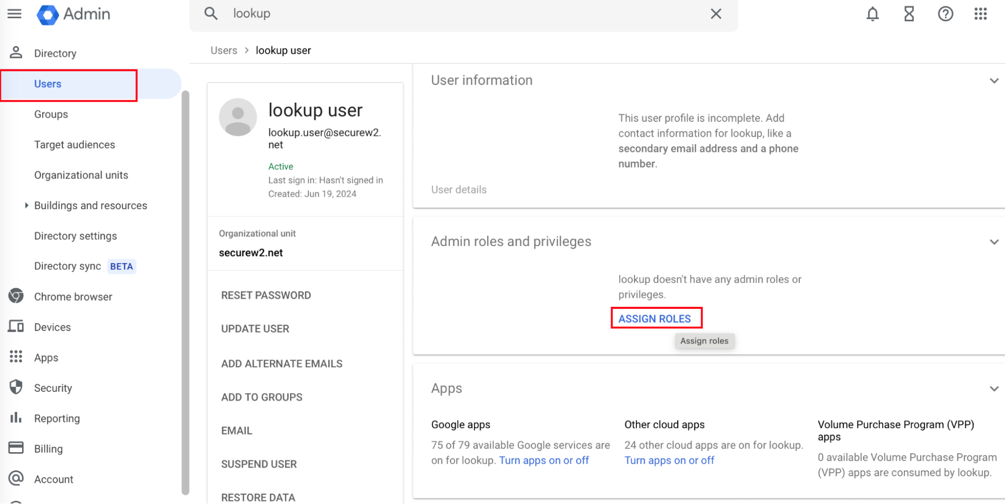 - Navigate to Users and select the user created in 4.2 Creating a User in Google Admin Console section.