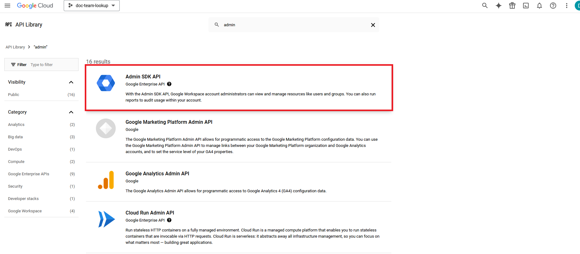 - In the API Library page, in the search box, enter Admin SDK API.