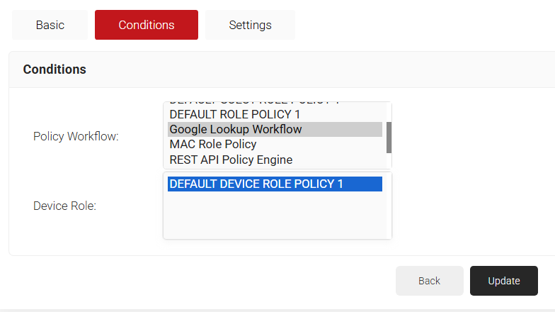 Similar to the check during certificate issuance, Lookup can be used before the RADIUS Authentication as a dynamic check. To trigger the lookup during the RADIUS Authentication, map the policy engine workflow created in section 5.3.2 Policy Workflows in the Network Policy created below: