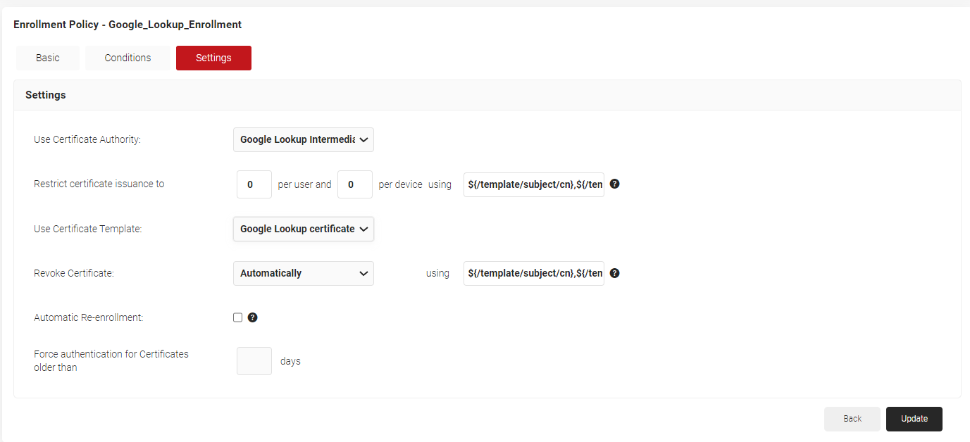 Now, the lookup can be used before the certificate issuance as a dynamic check. To trigger the lookup during the certificate issuance, map the policy engine workflow created in section 5.3.2 Policy Workflows in the enrollment policy created below: