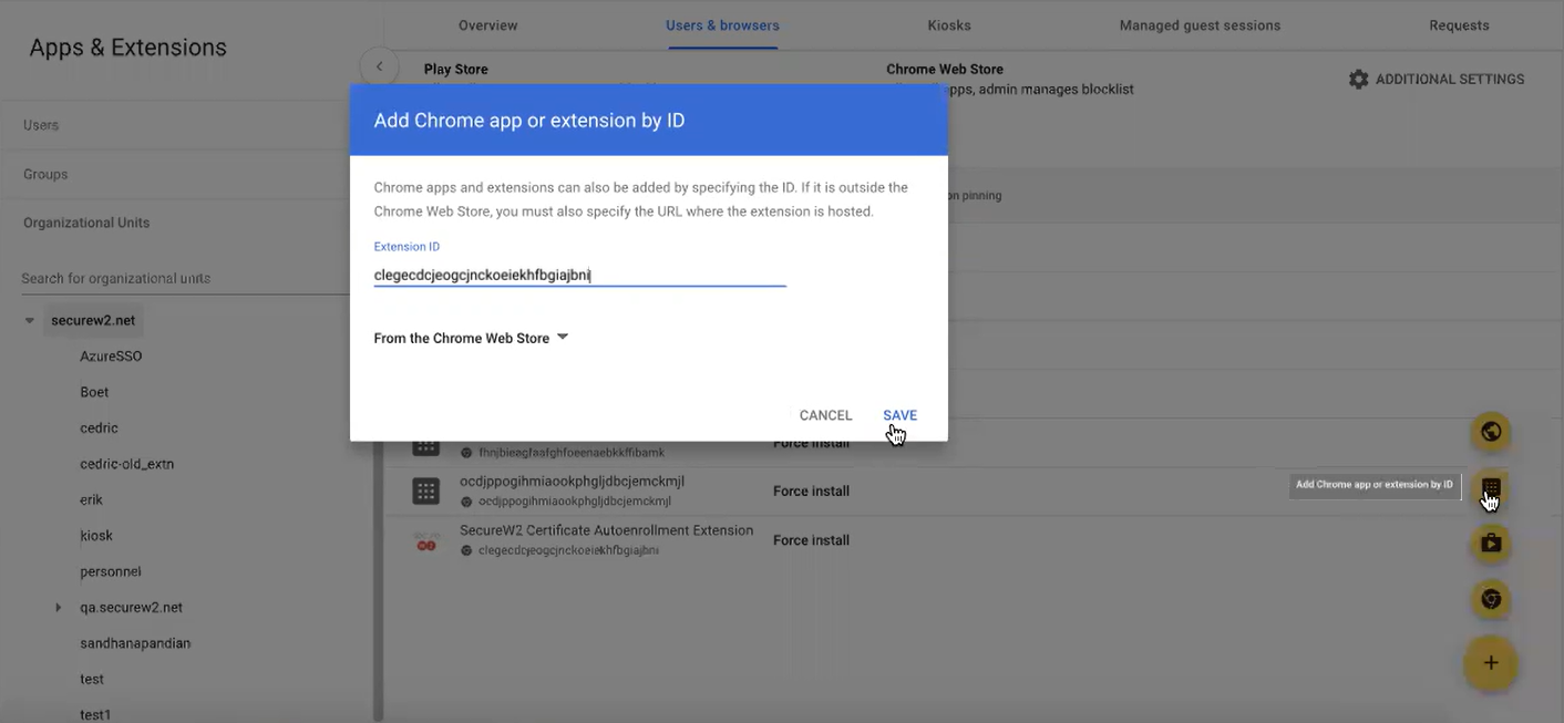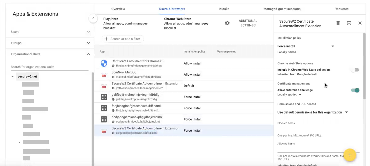 - On the left pane, from the Organizational Units drop-down-list, select the organization unit where you added the chrome app using the extension ID.