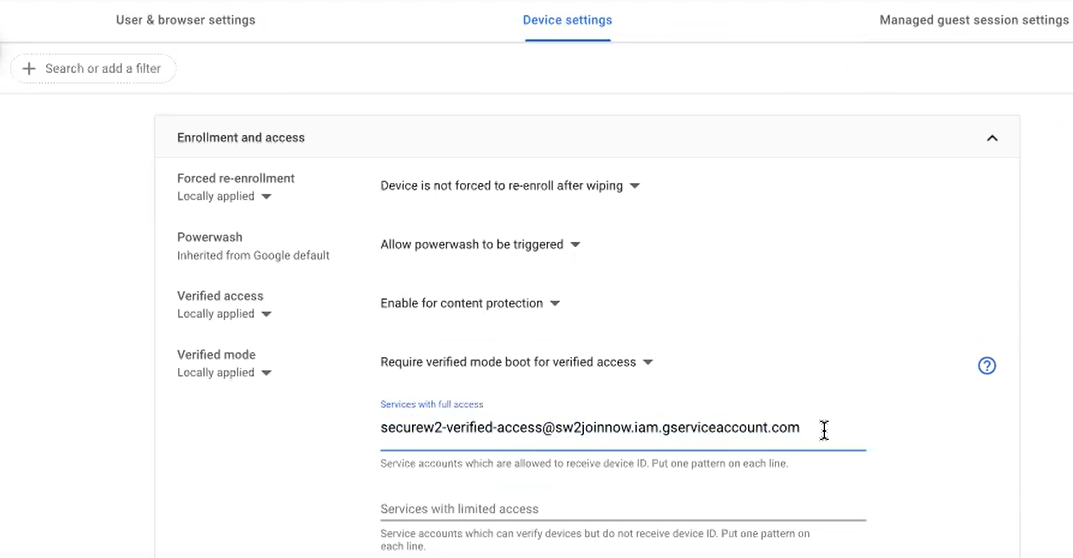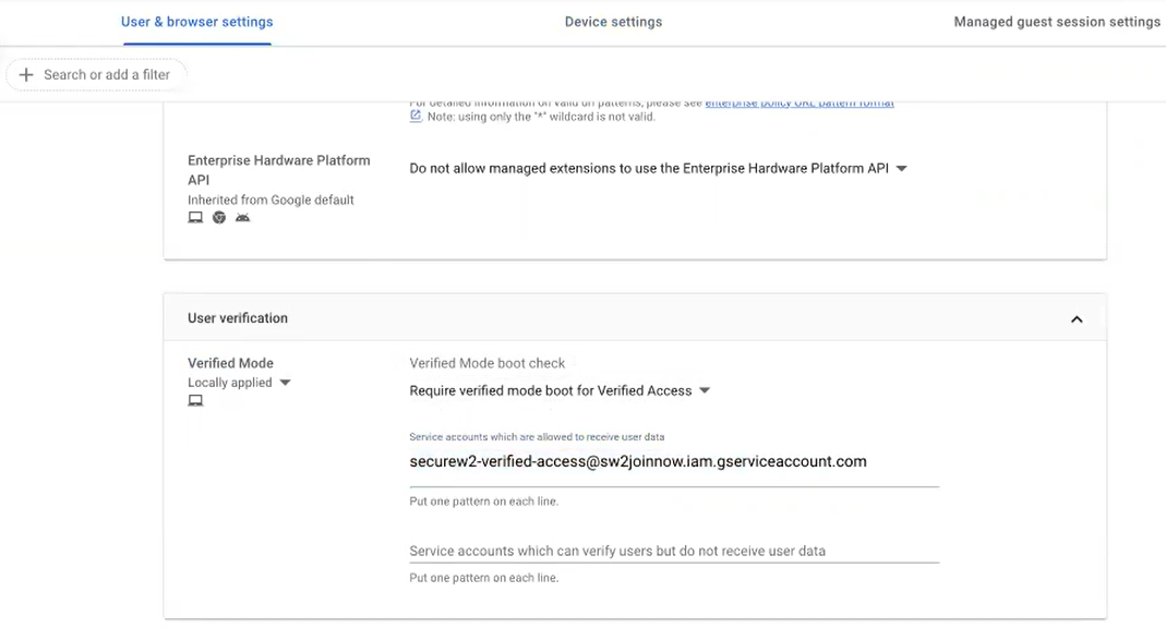 - Grant Google Chrome verified access permission to SecureW2’s managed support service account to install the required settings.