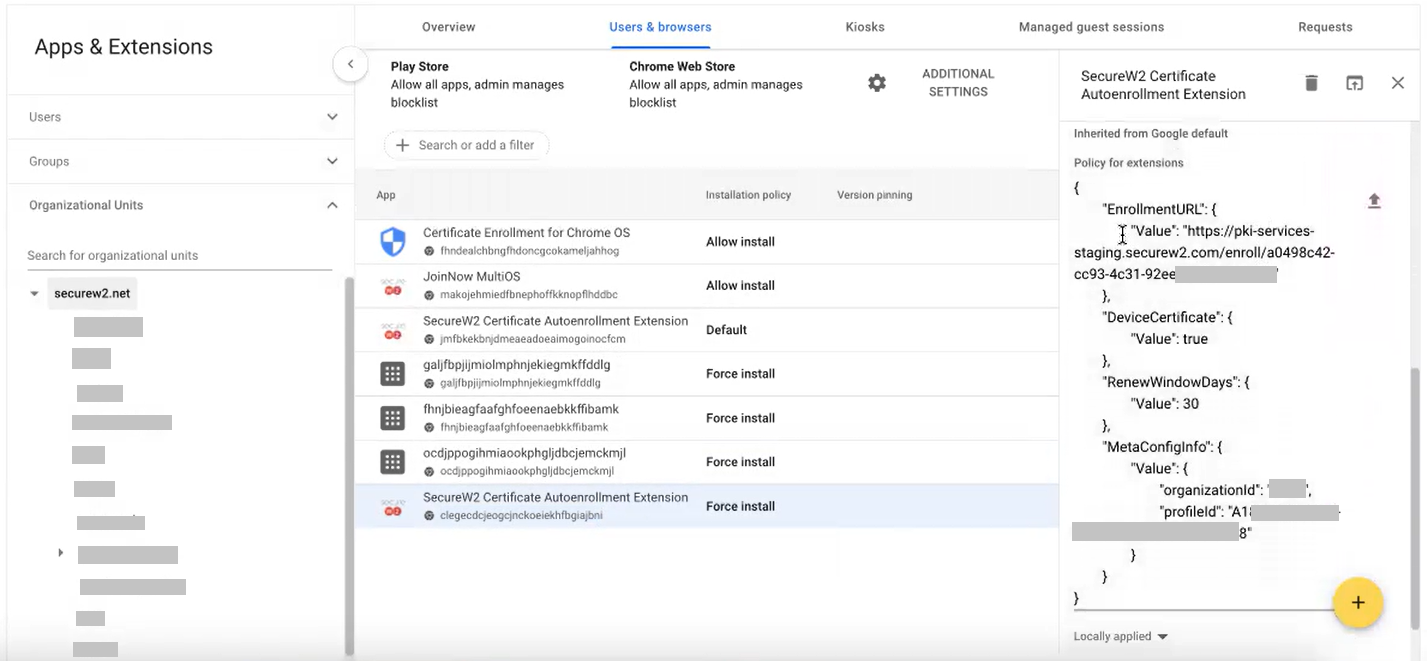 - Configure the extension ID, which is used to install and push the JoinNow Chrome extension for auto-enrollment of a device that is provided by the SecureW2 support team.