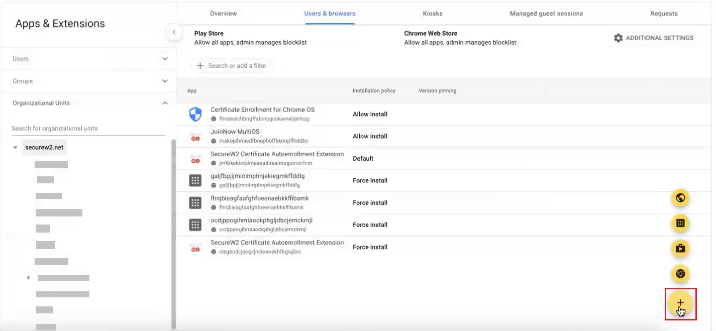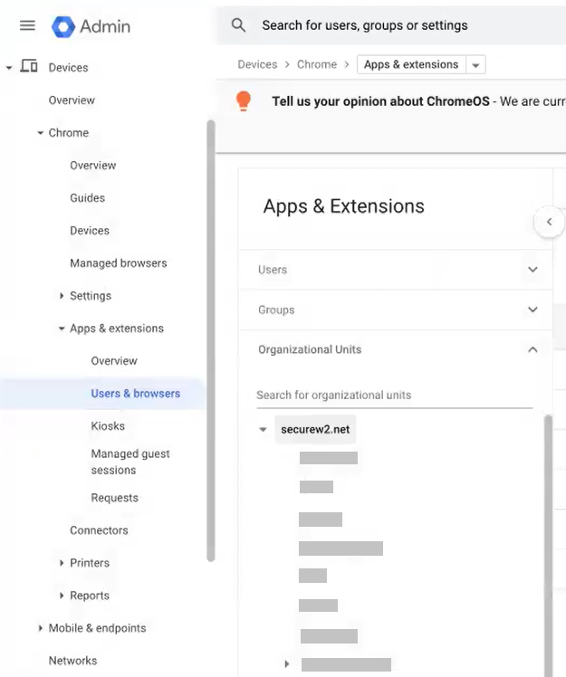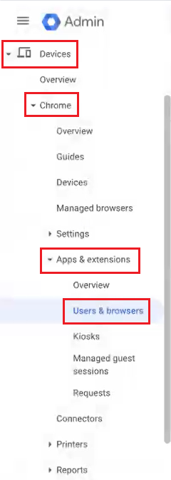 - In the Google Admin Console, navigate to Devices > Chrome > Apps & extensions > Users & browsers.