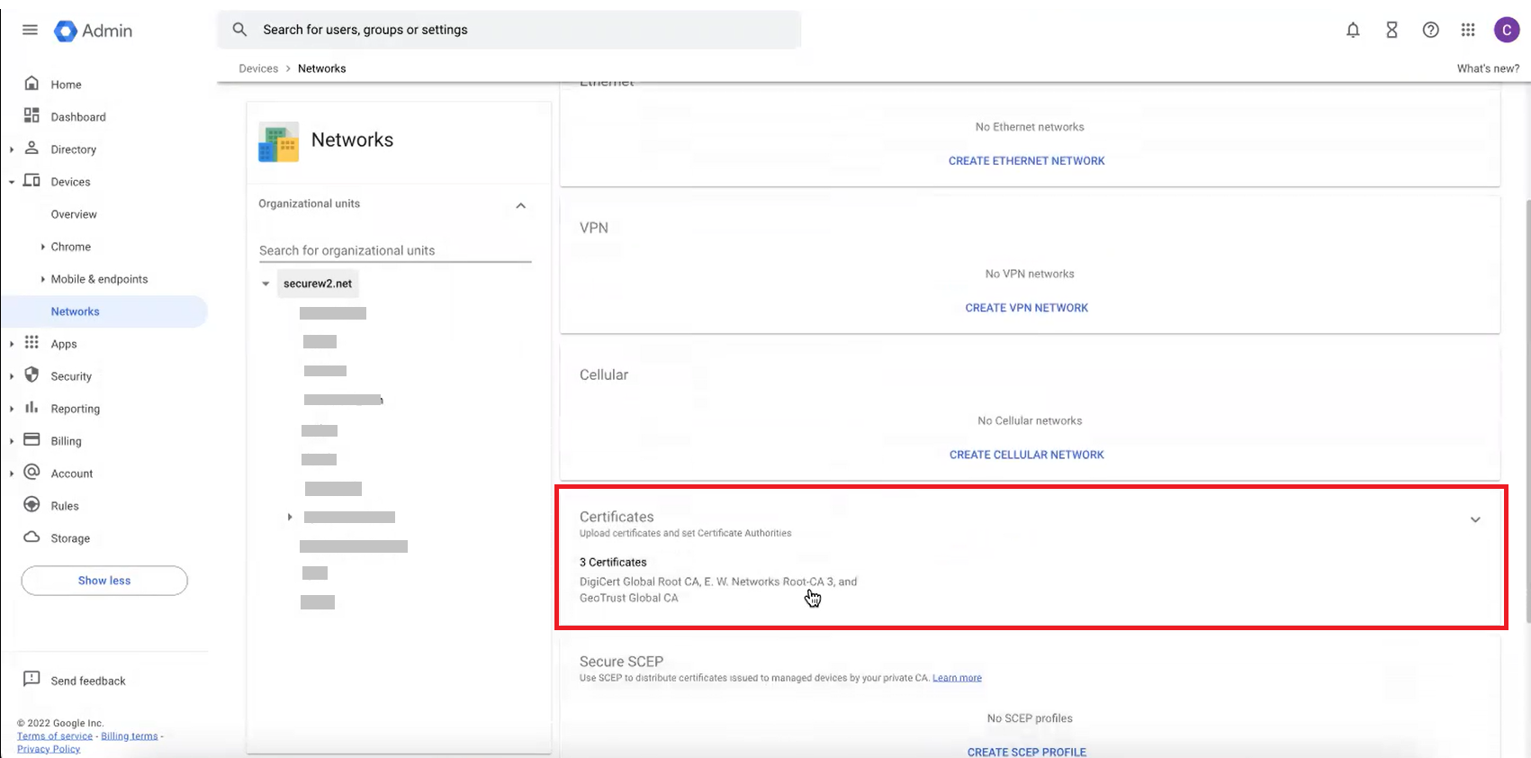 In the next section below, you will need to upload a JSON configuration (a certificate enrollment protocol similar to the Simple Certificate Enrollment Protocol) file to the Google Admin Console. Please contact SecureW2 support during this stage, and they will provide you with the required JSON file.