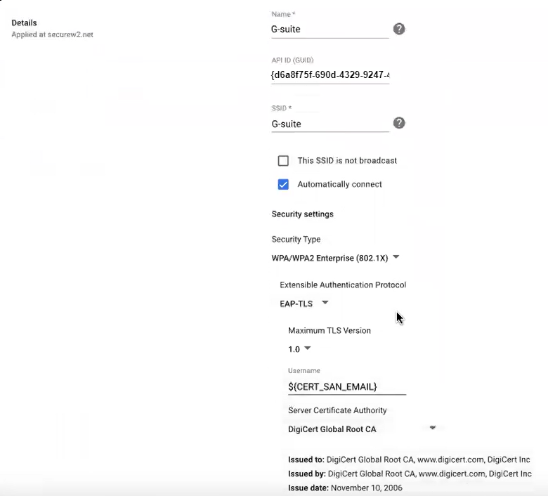 Finally, configure the network settings that will be pushed to the Chromebooks so that they will authenticate the SSID by using SecureW2 for certificate-based Wi-Fi authentication.