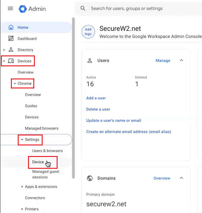 - Navigate to Devices > Chrome > Settings > Device.