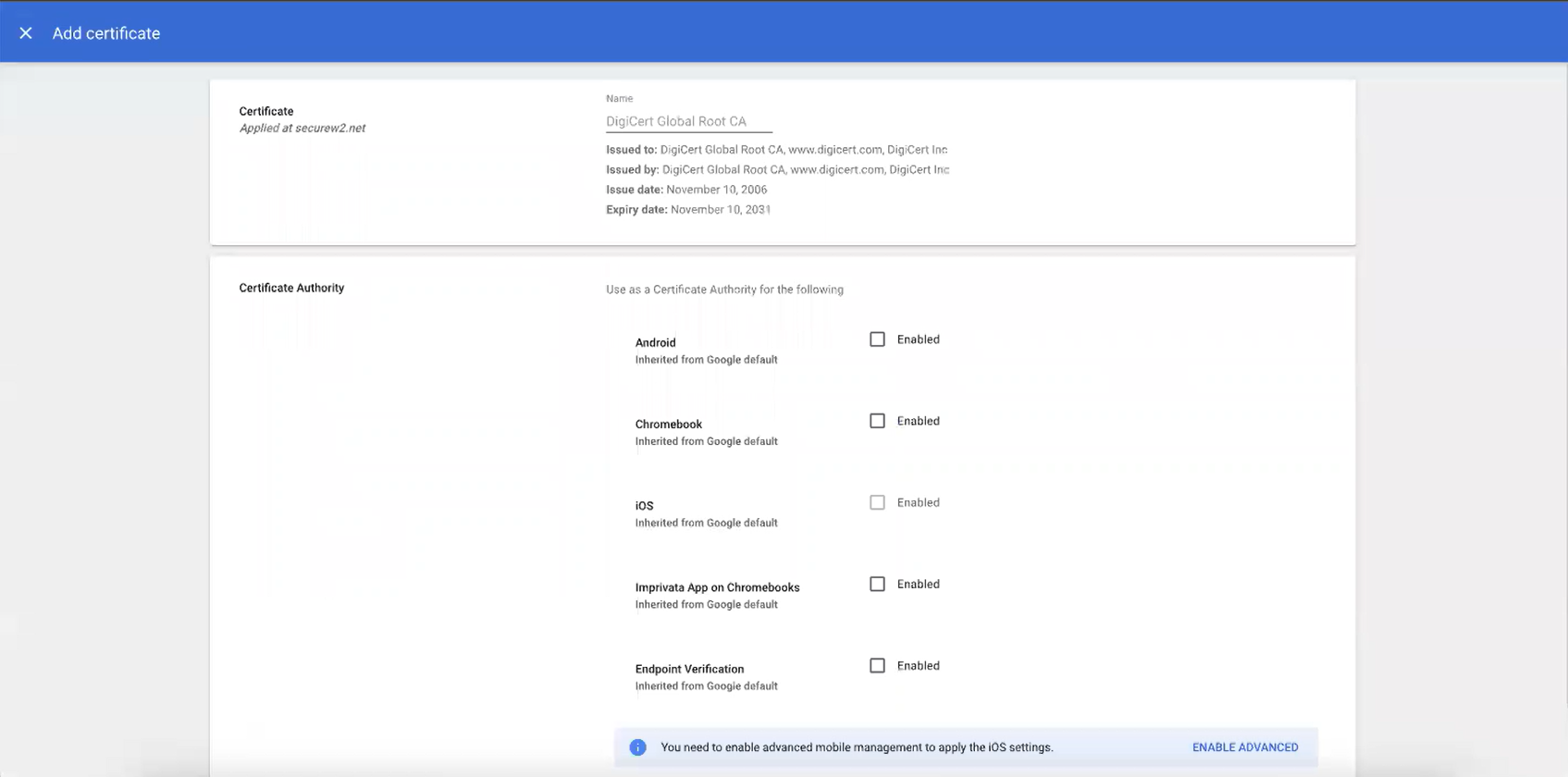 WPA2-Enterprise requires installing and configuring the trusted RADIUS Server issuer CA chain to allow the device to securely connect to the Wi-Fi network. This is also handled by the Google Admin Console. You can select the uploaded CA as the trusted CA in the configured Network, later.
