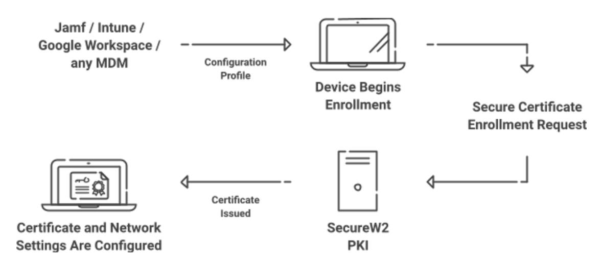 SecureW2s JoinNow will automate certificate issuance through JSON which is similar to the Simple Certificate Enrolment Policy (SCEP) for distributing certificates to all your managed device. You can also manage auto revocation of expired certificates for your device in our management portal.