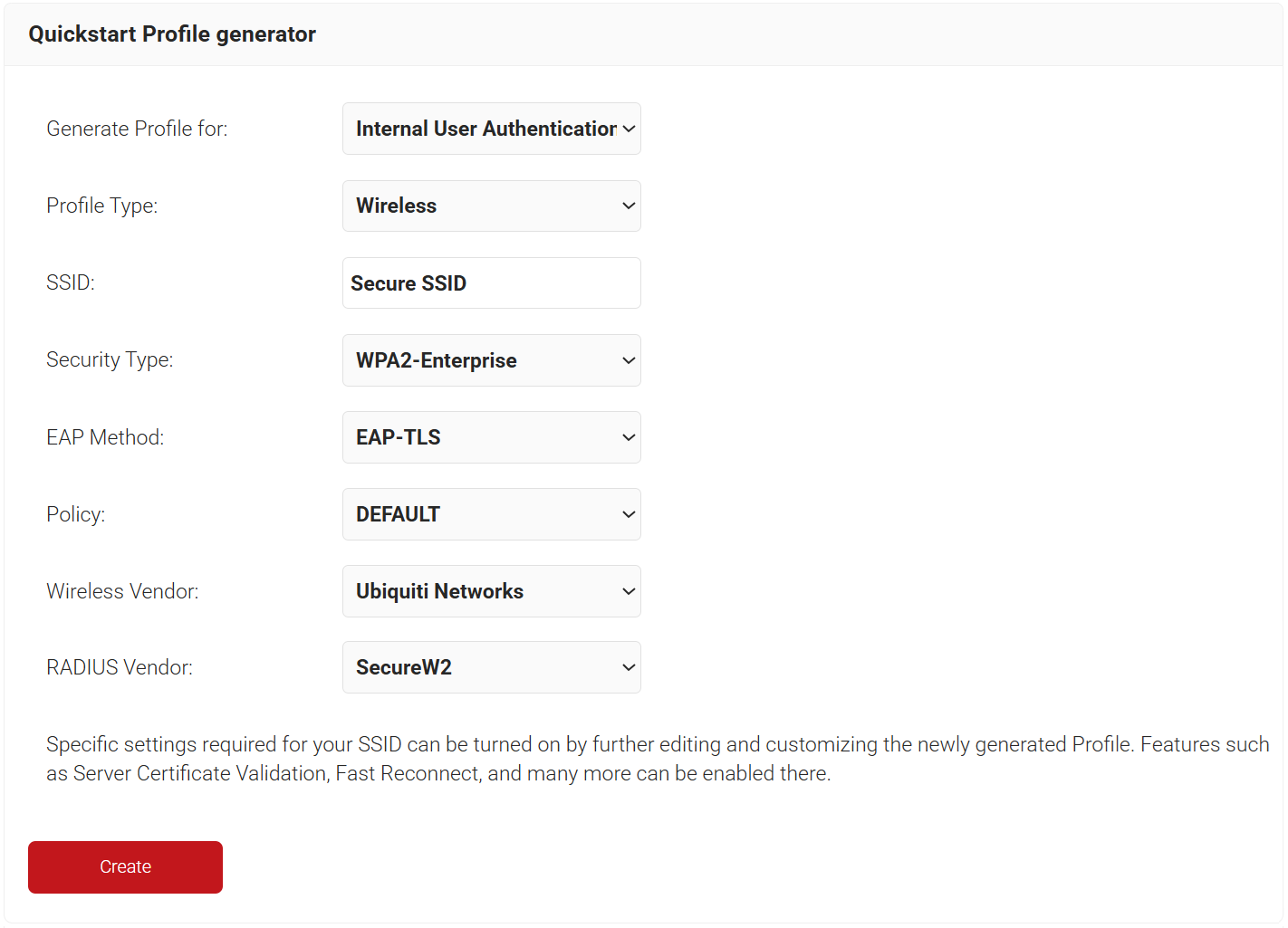 - On the Quickstart Network Profile generator page, from the Generate Profile for drop-down list, select Internal User Authentication.