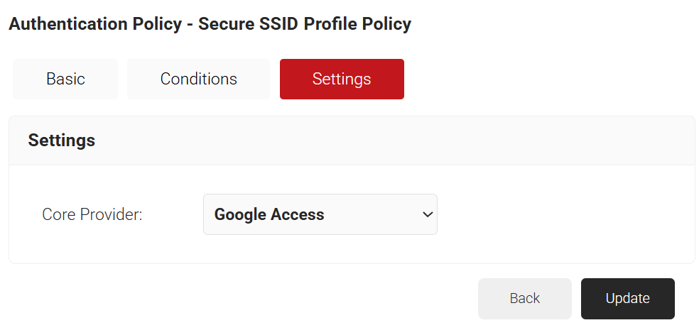 An Authentication Policy connects a core provider with a Network Profile. This is necessary so only our Google-managed Chromebooks can connect to our network. We will need to configure an Authentication Policy to tie the Network Profile we just created, with the Google Verified Access Device Management Platform that we made at the beginning of the document.