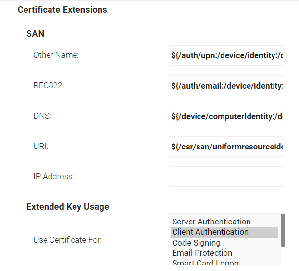 a. In the Other Name field, enter ${/auth/upn:/device/identity:/csr/san/othername}b. In the RFC822 field, enter ${/auth/email:/device/identity:/csr/san/rfc822name}