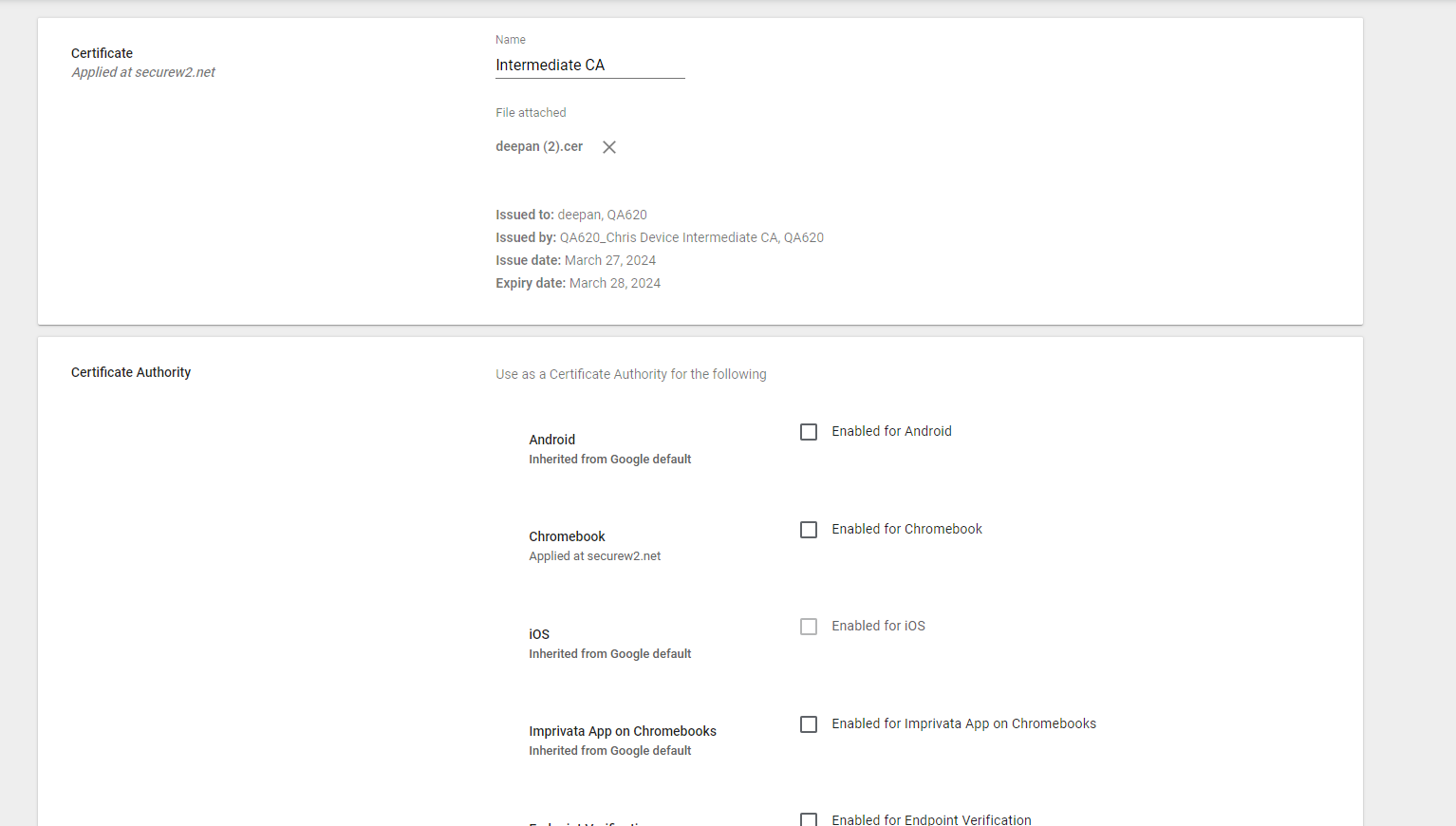 Trusted certificate profiles can be created in Google workspace console and uploaded with SecureW2 Intermediate and RADIUS Server certificate to create a chain of trust. To create certificate profiles and upload CA certificates:
