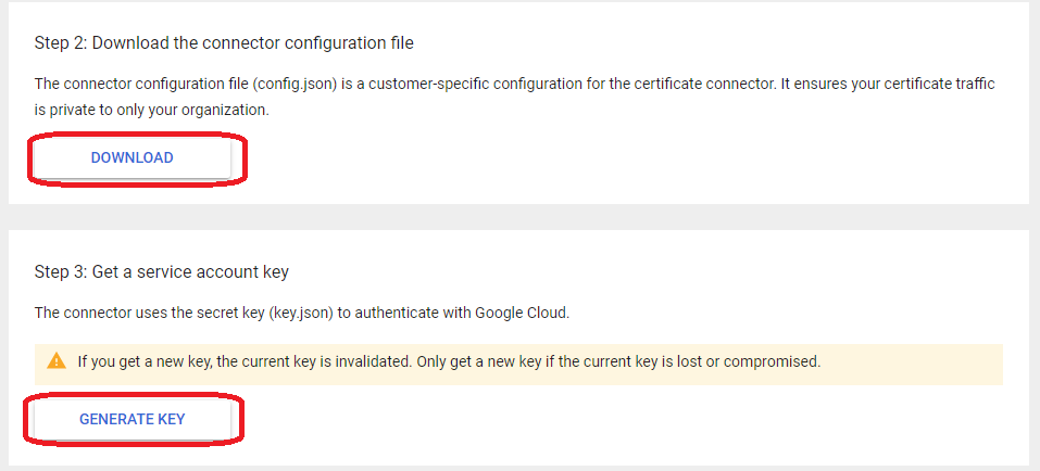 Google uses a cloud certificate connector to establish a secure link between your SCEP server and Google Cloud. You can manually set up and secure the certificate connector by utilizing a configuration file and a key file, both specific to your organization.