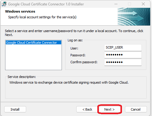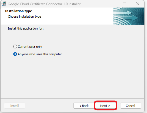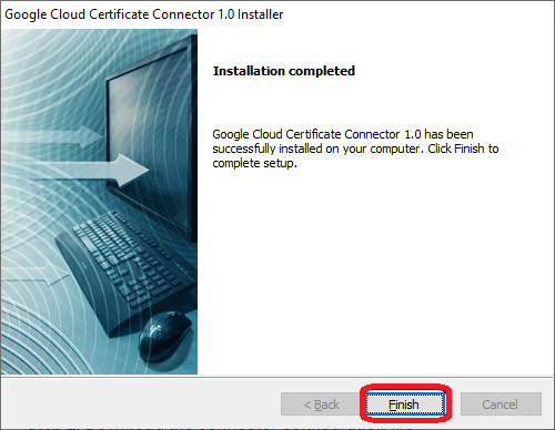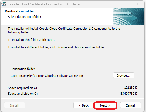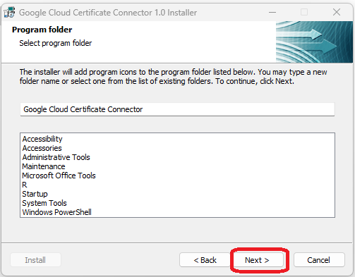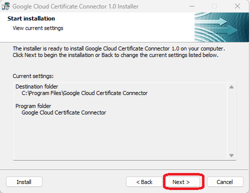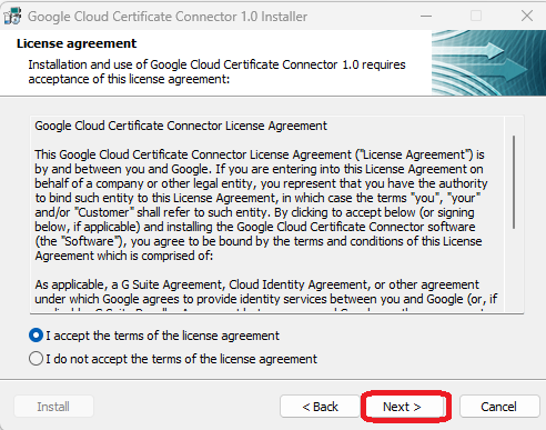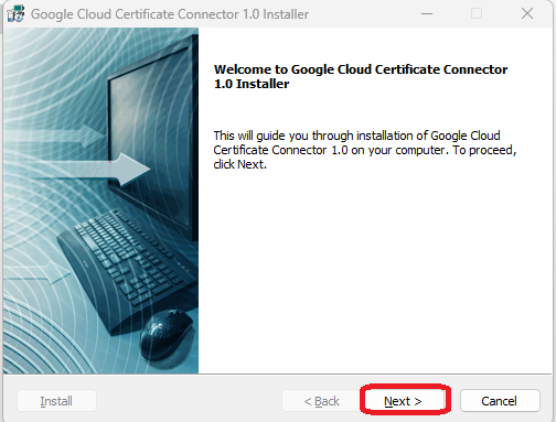 - Run the downloaded connector file (google-cloud-certificate-connector-setup.exe). The Google Cloud Certificate Connector Installer wizard will open.