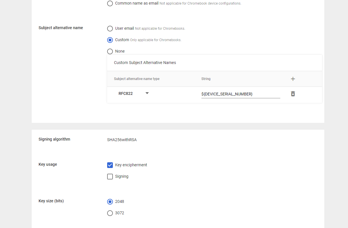- From the Subject alternative name type drop-down, select RFC822. In the adjacent field, enter ${DEVICE_SERIAL_NUMBER}.
