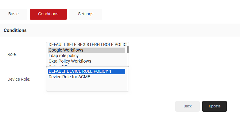 - In the Conditions section, from the Role drop-down list, select the role policy you created earlier (see the Policy Workflow section).