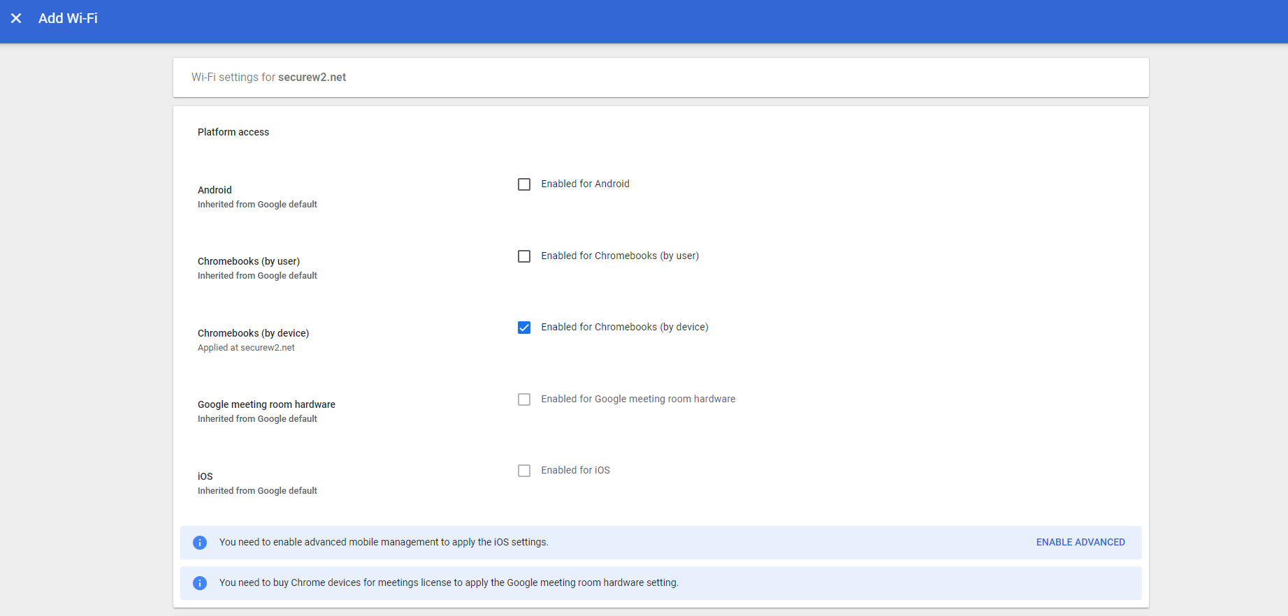 - Under Platform access, select Enabled for Chromebooks (by device) option.