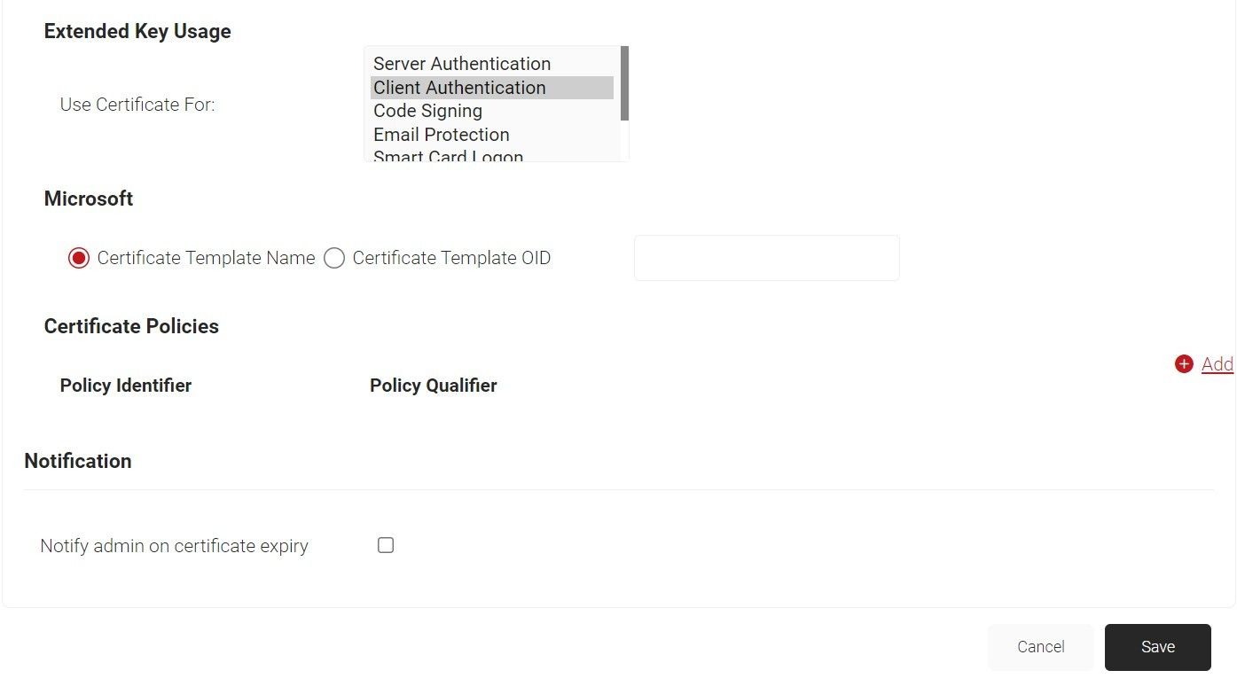 - In the Extended Key Usage section, from the Use Certificate For list, select Client Authentication.