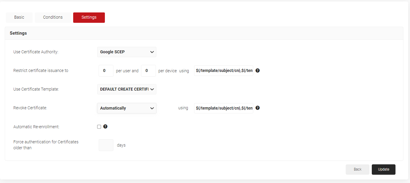 - In the Settings section, from the Use Certificate Authority drop-down list, select the intermediate CA you created earlier (see the Creating an Intermediate CA for Google SCEP Gateway Integration section).