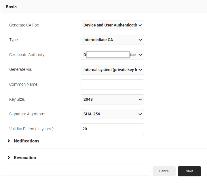 - In the Basic section, from the Generate CA For drop-down list, select the Device and User Authentication option to authenticate devices and users.
