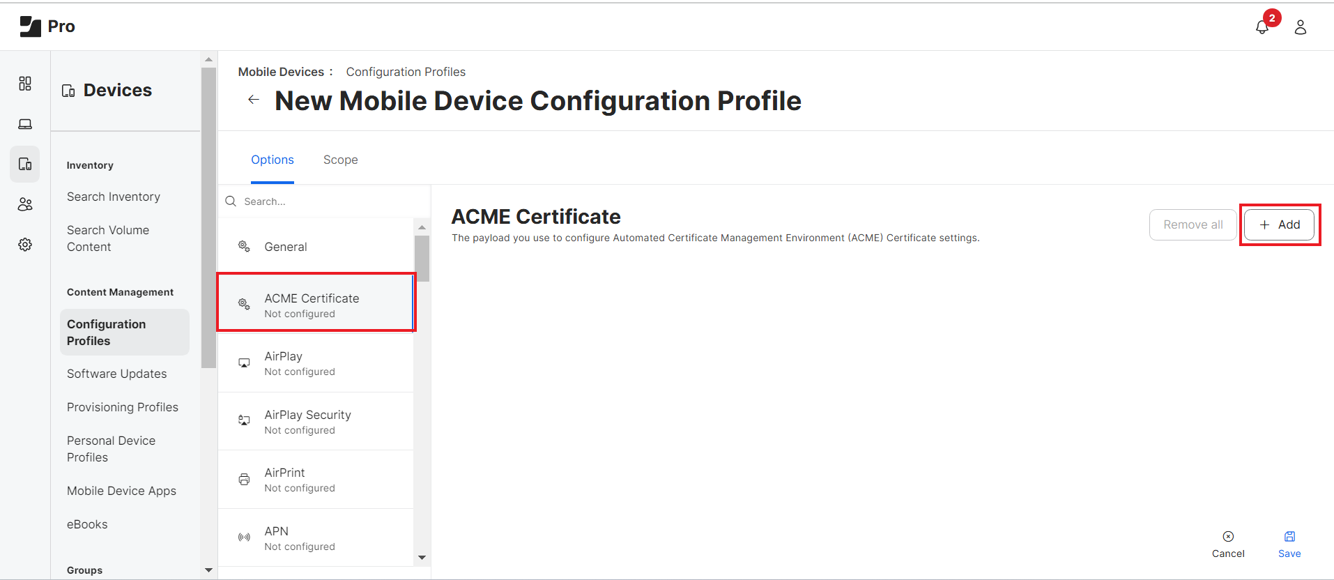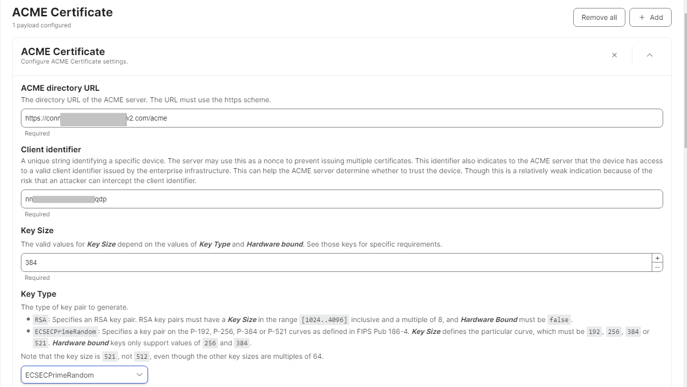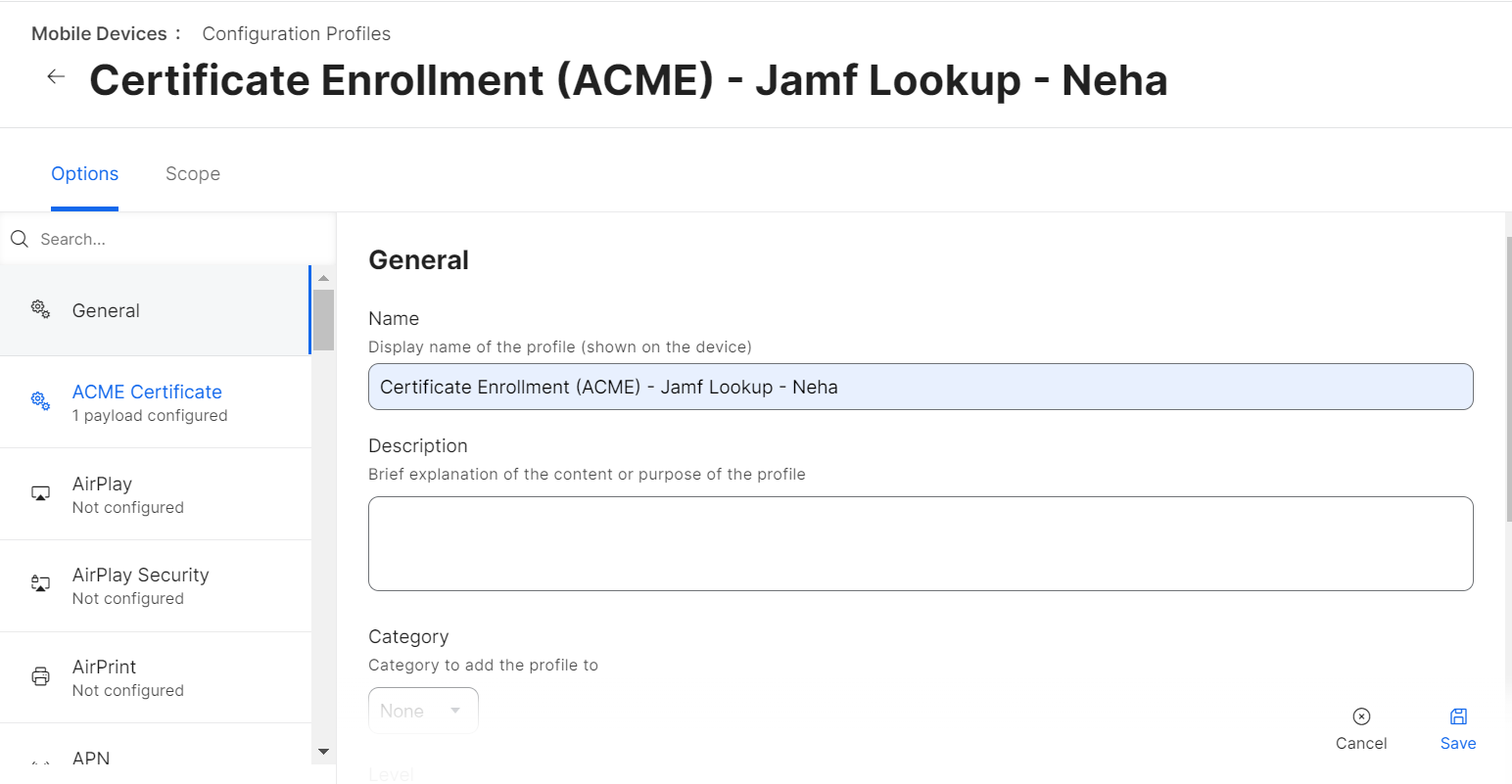 In order to initiate the ACME certificate enrollment on the client devices, a .mobileconfig file should be created in JoinNow and pushed to the required devices/device groups via Jamf.