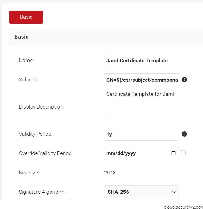 It is recommended to create a separate template for each MDM platform for easier identification of different values being passed. To create an Jamf Certificate Template: