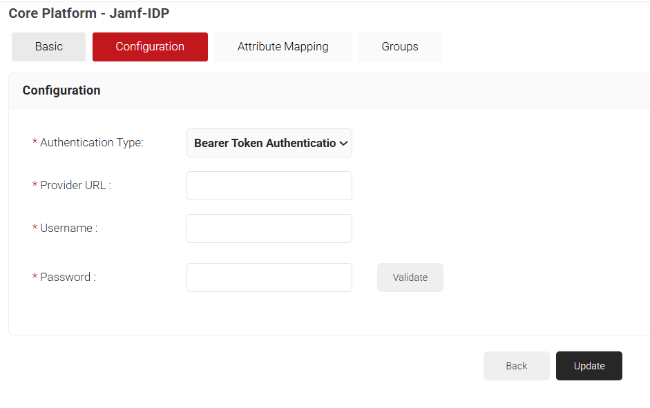 - From the Authentication Type drop-down, select the required authentication type for Lookup. Below are the provided options:a. Bearer Token – Authentication is done using Jamf user credentials. i. For Provider URL, enter the JAMF URL of the organization.