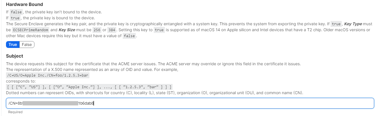 - In the Subject field, enter the value corresponding to “Subject” in the .mobileconfig file. The value must be added as”/CN=value” format.