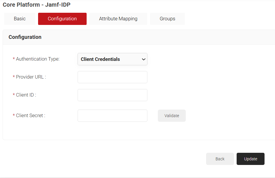 b. Client Credentials – Authentication is done using Client credentialsi. For Provider URL, enter the JAMF URL of the organization.