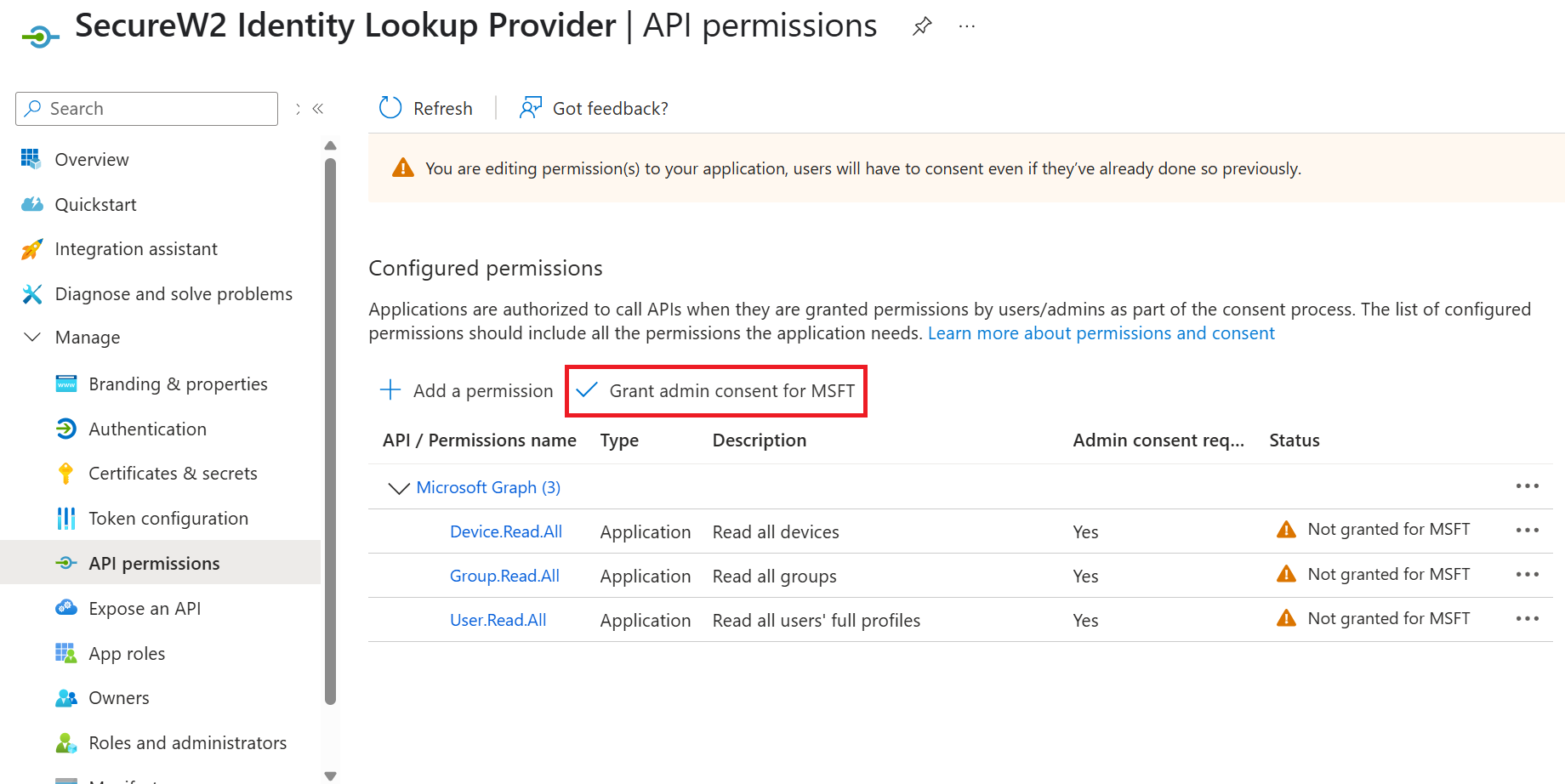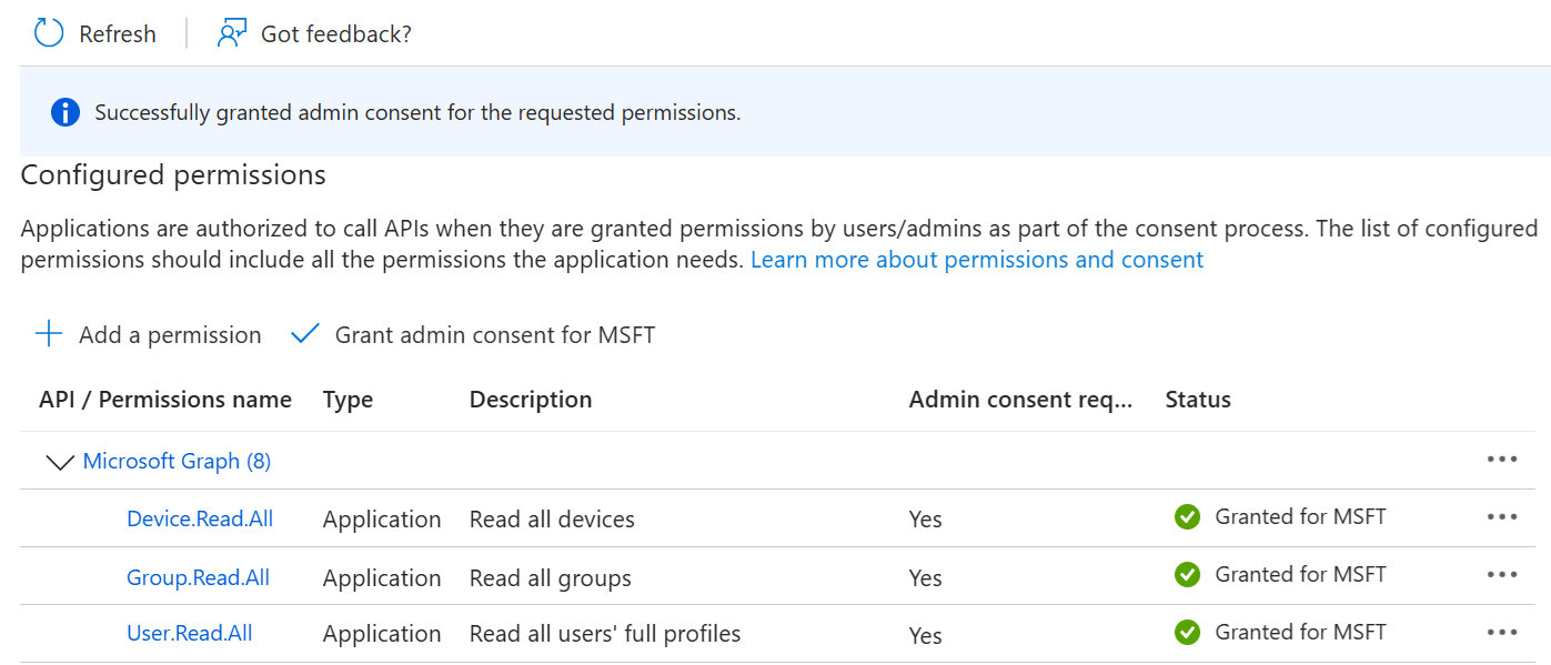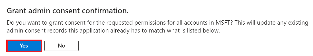 - In the Grant admin consent confirmation pop-up window, click Yes.