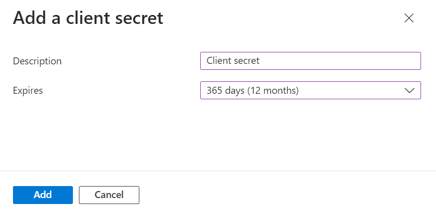 - From the Expires drop-down list, select the expiration date of the client secret.