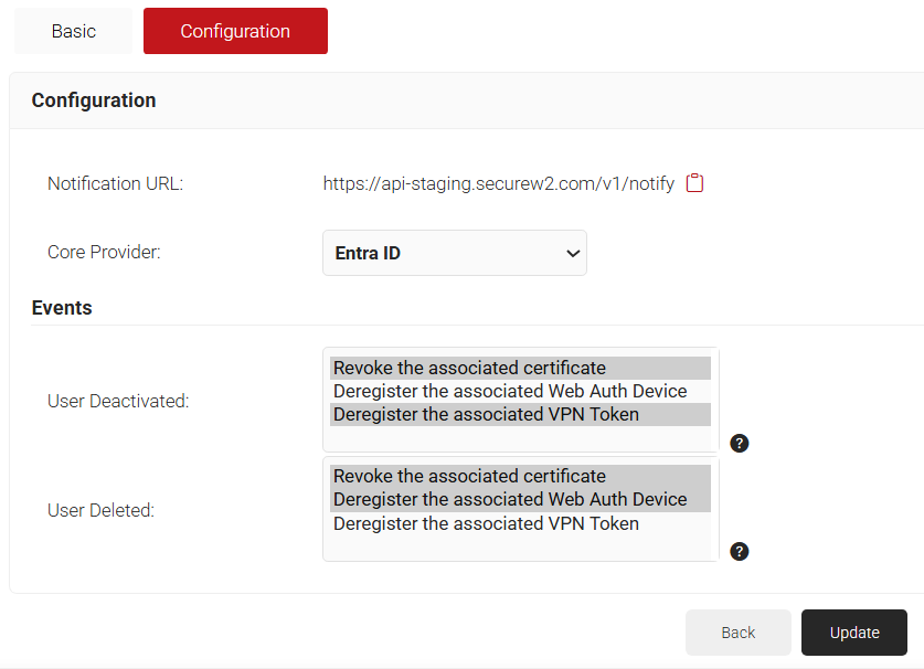 Once the above configurations are completed, deactivating or deleting a user in Azure will automatically revoke their corresponding certificates, de-register Web Authenticated devices, and deactivate VPN tokens, depending on the setup in the JoinNow Portal. These actions can be monitored through the Events section. This process prevents affected devices from reconnecting to the network or VPN.