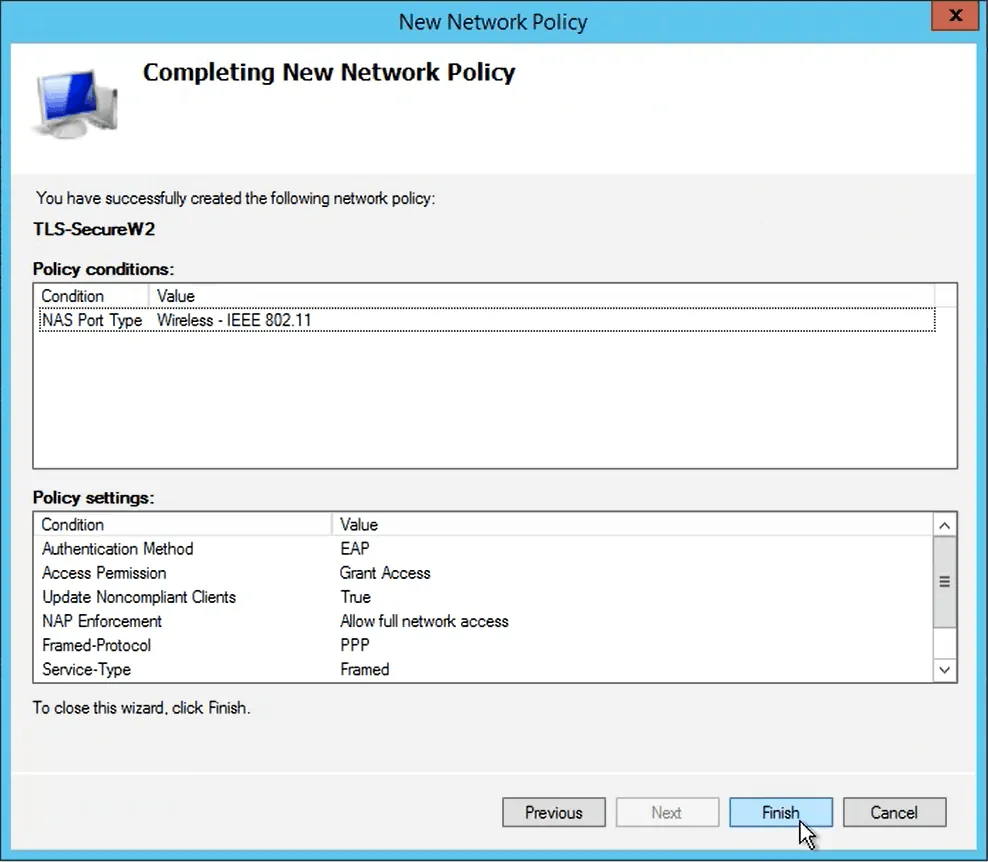 - In the Completing New Network Policy window, click Finish.