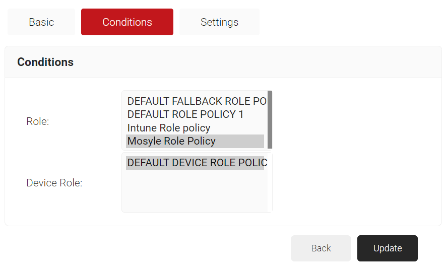 - In the Conditions section, select the Policy Workflows you created earlier from the Role list (refer to the Configuring a Policy Workflows section).