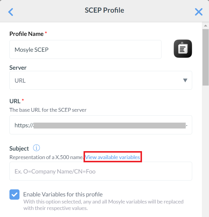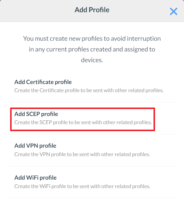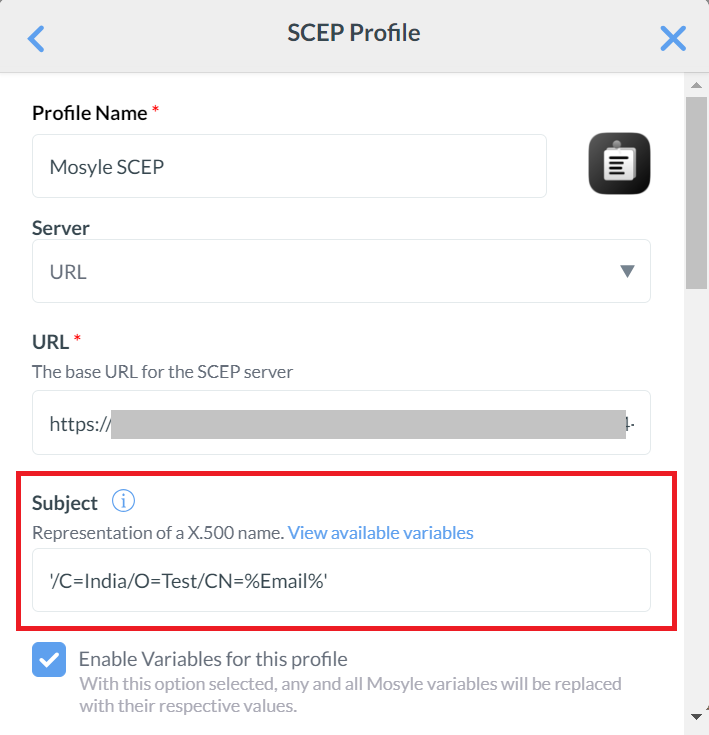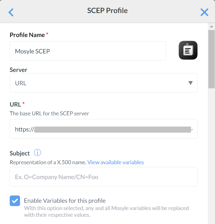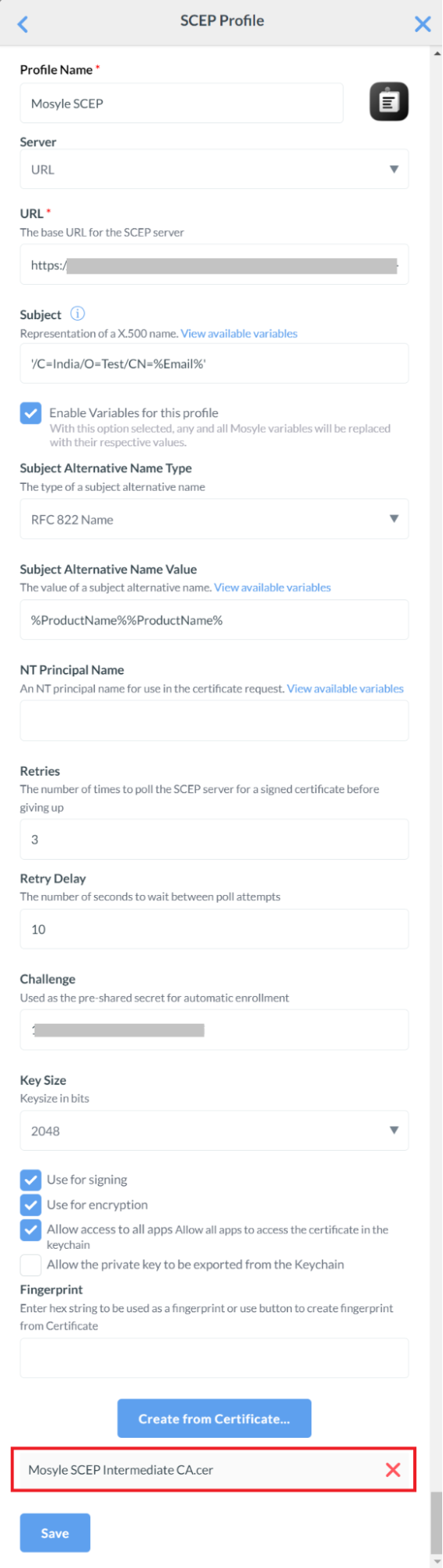 - Ensure that the SCEP profile is configured accurately. For more information, see the Creating an Intermediate CA for Mosyle SCEP Gateway Integration section.