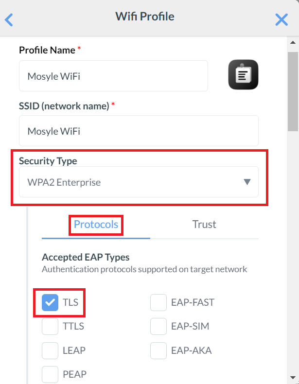 NOTE: You require a Mosyle Premium subscription for an automated Wi-Fi connection.
